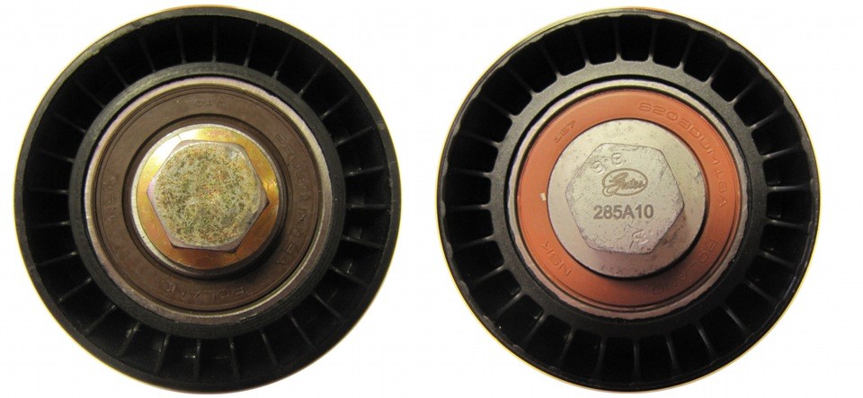 Отличий практически не видно, но мы перевернем ролик и видим, что на оригинале от Gates присутствует оригинальная гравировка на головке болта, а вот производитель подделки не стал ее изготавливать.