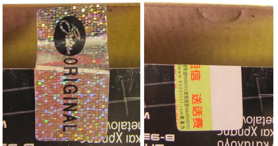 На упаковке с поддельным комплектом даже есть голограмма, и эти две голограммы внешне очень похожи. Но поддельная немнго короче по длинне настоящей примерно на 1 сантиметр, да и преклеена она очень плохо, ее легко можно оторвать…