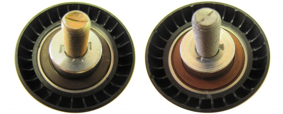 Как нам показалось на первый взгляд ролики сложно отличить и они похожи. Но при более детальном осмотре оказалось, что на контрафактном ролике, в отличие от Gates, производитель подделки не стал наносить гравировки на металлические детали ролика и маркировку пластикового края, чтобы не тратить лишних средств. Перевернем ролики и мы видим, что, на поддельном ролике нанесена маркировка на металле, но ее качество не сравнимо с гравировкой, которая наносится на ролики Gates. И еще одно отличие, маркировка нанесена не везде.