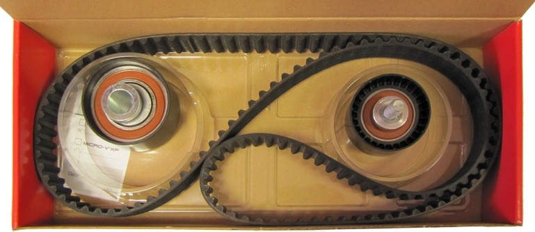 Открываем упаковку комплекта. Теперь мы увидели, в чем же главное отличие оригинального комплекта от поддельного. Внутри оригинального комплекта имеется специальная пластиковая форма для правильного укомплектовании продукции. В поддельном комплекте ролики и ремень ГРМ упакованы в обыкновенные полиэтиленовые пакеты.